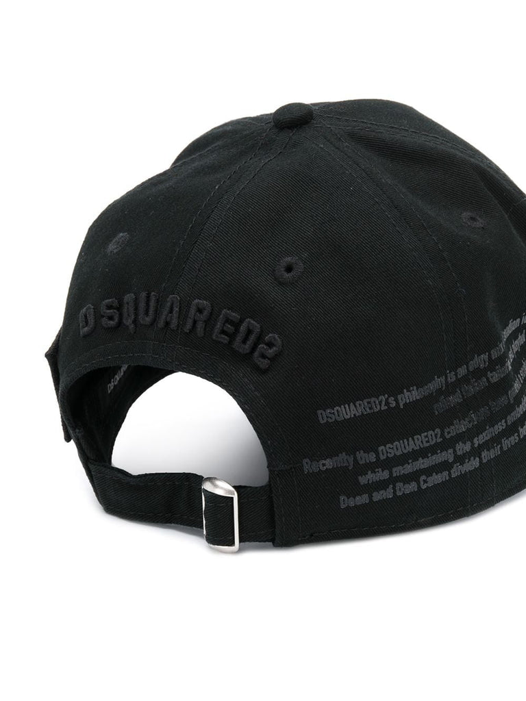 Be an icon in this black cotton Icon embroidered baseball cap from DSQUARED2. Designed with a distressed finish and a brand bio printed to the side, this laid-back accessory is the perfect piece to finish your look. Featuring a curved peak, a distressed finish, 'Icon' embroidery to the front, a brand patch to the side, an adjustable strap to the back, a printed brand bio to the side and an embroidered logo to the back.
