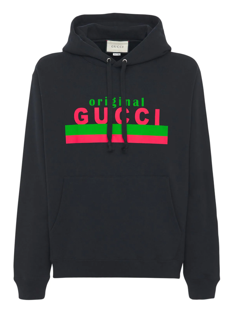 Combining the old with the new is the Gucci way. Made from black organic cotton, this Original Gucci printed hoodie will pave the way to your ideal casual wear edit. Keep comfy in style.