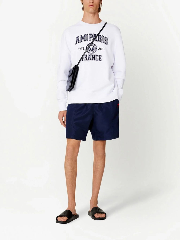 Navy blue embroidered logo to the side elasticated waistband above-knee length Be mindful to try on swimwear over your own garments.