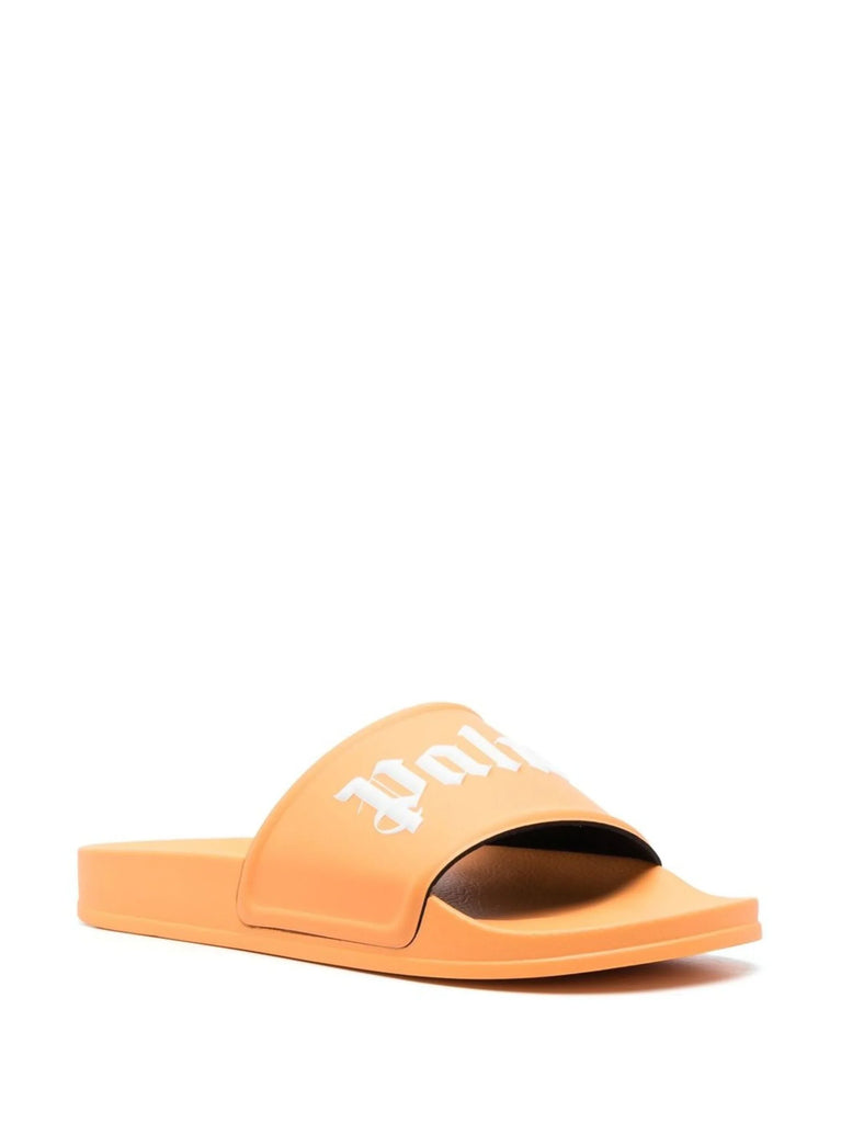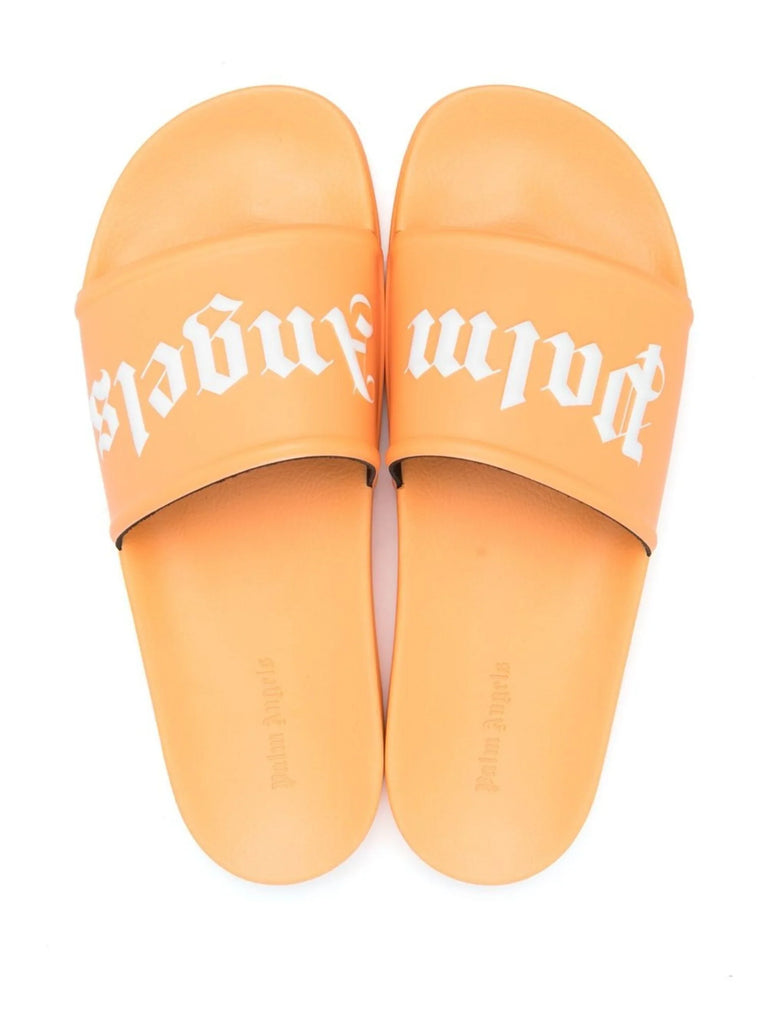 Palm Angels utilises contrasting orange and white tones to create an eye-catching look for these pool slides, whilst allowing the signature logo graphics to stand out at the front.