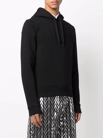 Valentino Embossed Logo Black Hoodie. Made with comfort and style in mind, this easy-to-wear hoody from valentino is a must have in your wardobe. Perfect luxuary look, made in italy this soft feel jumper featuing the brand name across the chest.